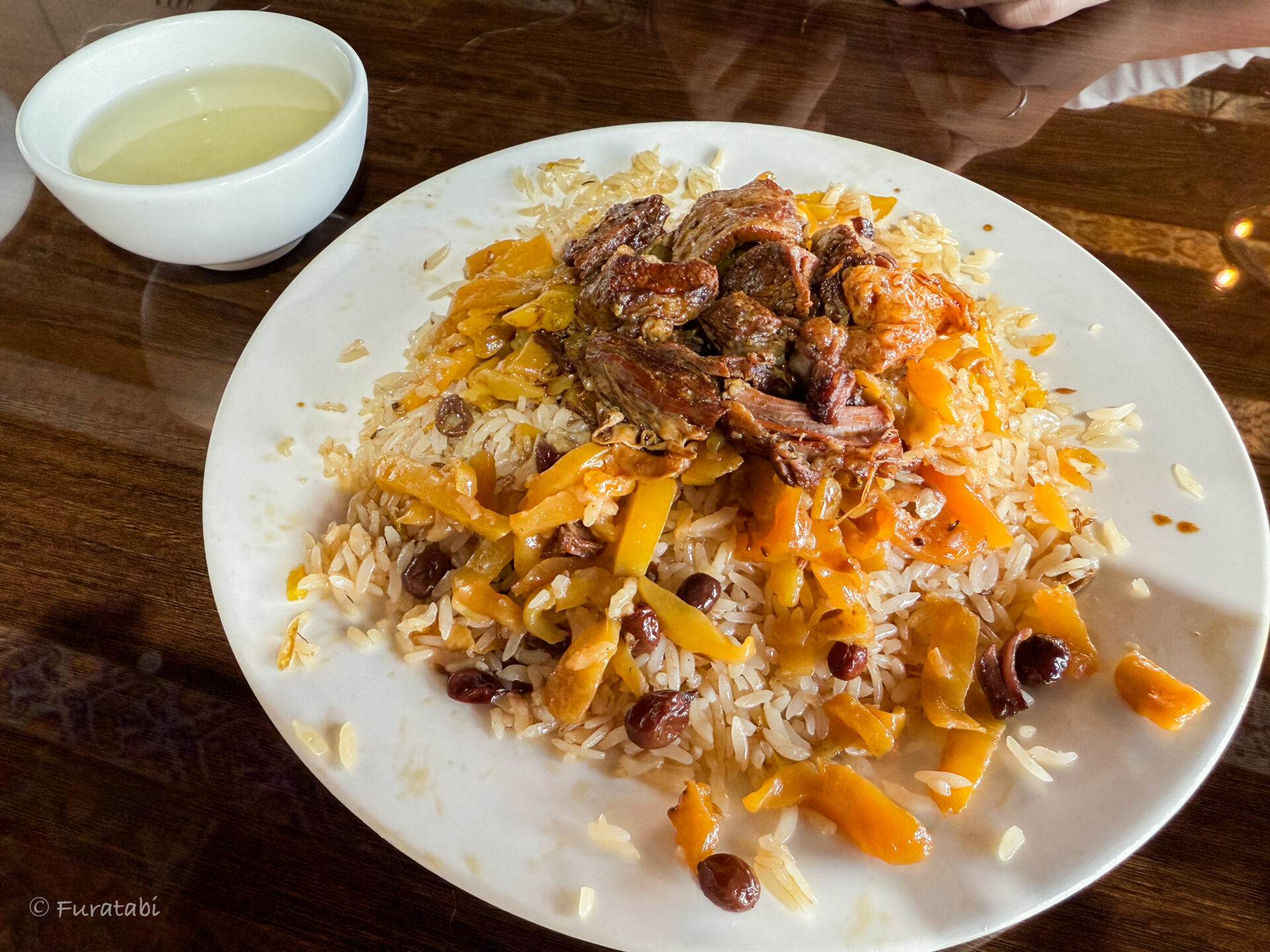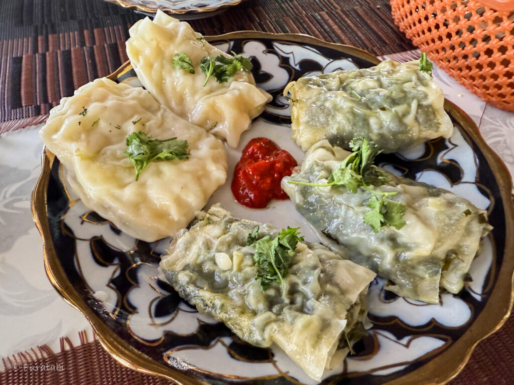 まずいただいたのは、蒸し餃子のマンティ。こちらも代表的なウズベキスタン料理の一つです。辛めのソースもついていて美味!