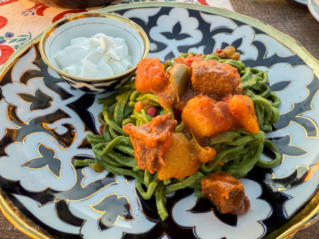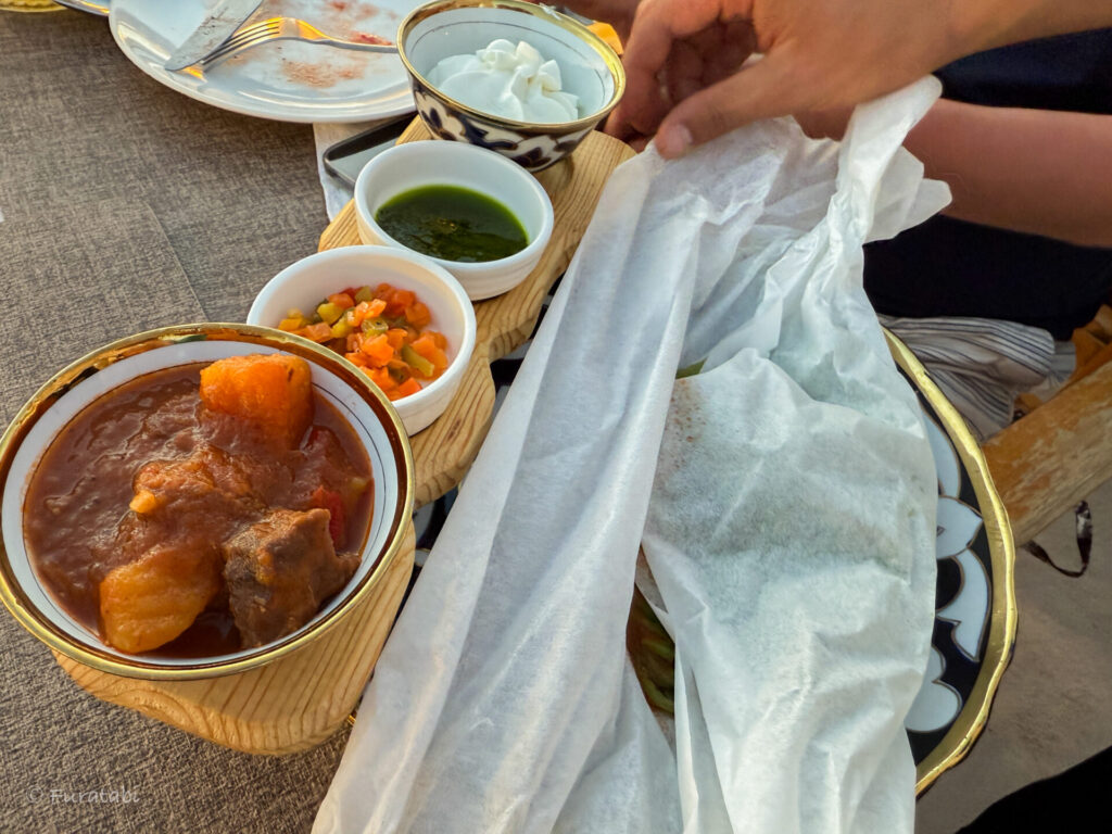 そして、外せないのがヒヴァの名物「シヴィットオシュ(Shivit Oshi)」。他の地域ではなかなか食べられないので、ヒヴァに来たらぜひトライしておきたいものです。ハーブが練り込まれた麺を、トマトのソース、ヨーグルトソースと一緒にいただくもの。このレストランでは、スタッフの方がテーブルに運んできた後に、仕上げをしてくださいます。麺を包んでいる紙を開いて、ソースを投入。混ぜて完成!さっぱりしていて美味しい一品です。