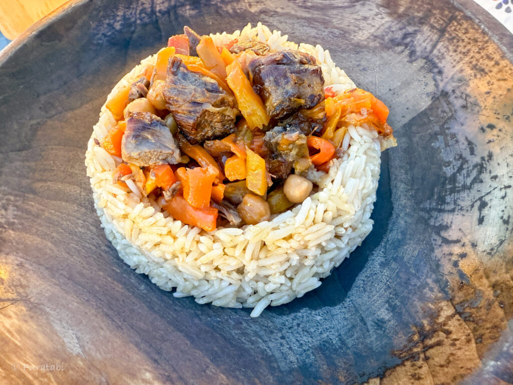 ウズベキスタン定番のプロフもとても美味しいのでおすすめです。やはり盛り付けもおしゃれ。お肉がゴロゴロ入っていて食べ応えがあります。