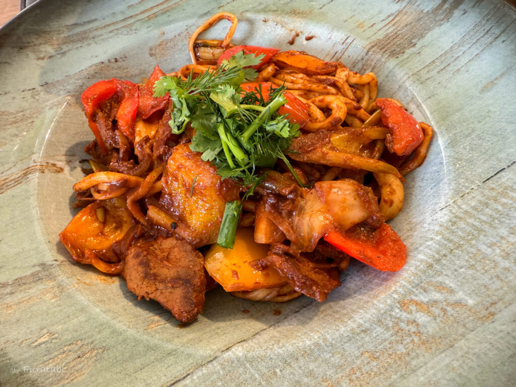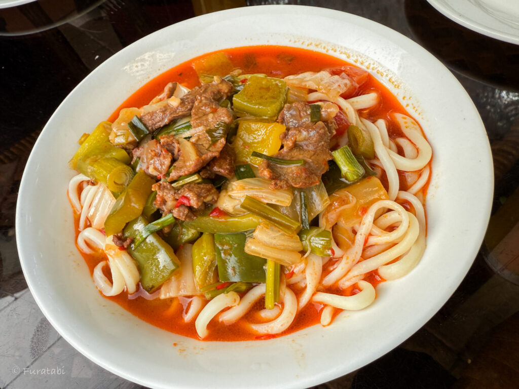 プロフに続いてウズベキスタンで食べられるのが、麺料理の「ラグマン(Laghman)」です。中央アジアで広く食べられていますが、ウズベキスタンのラグマンは、トマトベースでいただくのが定番です。讃岐うどんに近い、という感想も聞きます。焼きうどんのような、汁のないボソラグマン(またはボソラグマンとも言う)もあります。