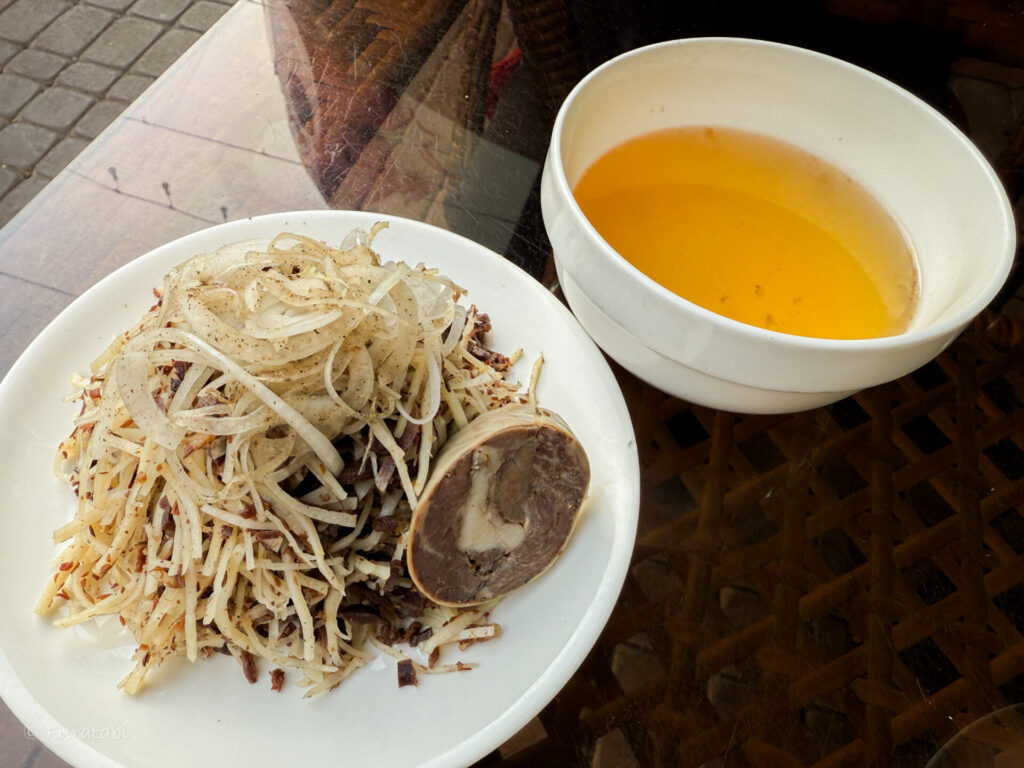 さらにタシュケントの名物料理と言われているのが、「ノリン(Norin)」です。馬肉のソーセージが添えられた、玉ねぎとお肉の混ぜ麺です。スープと一緒に提供され、つけながら食べてもいいのだそう。