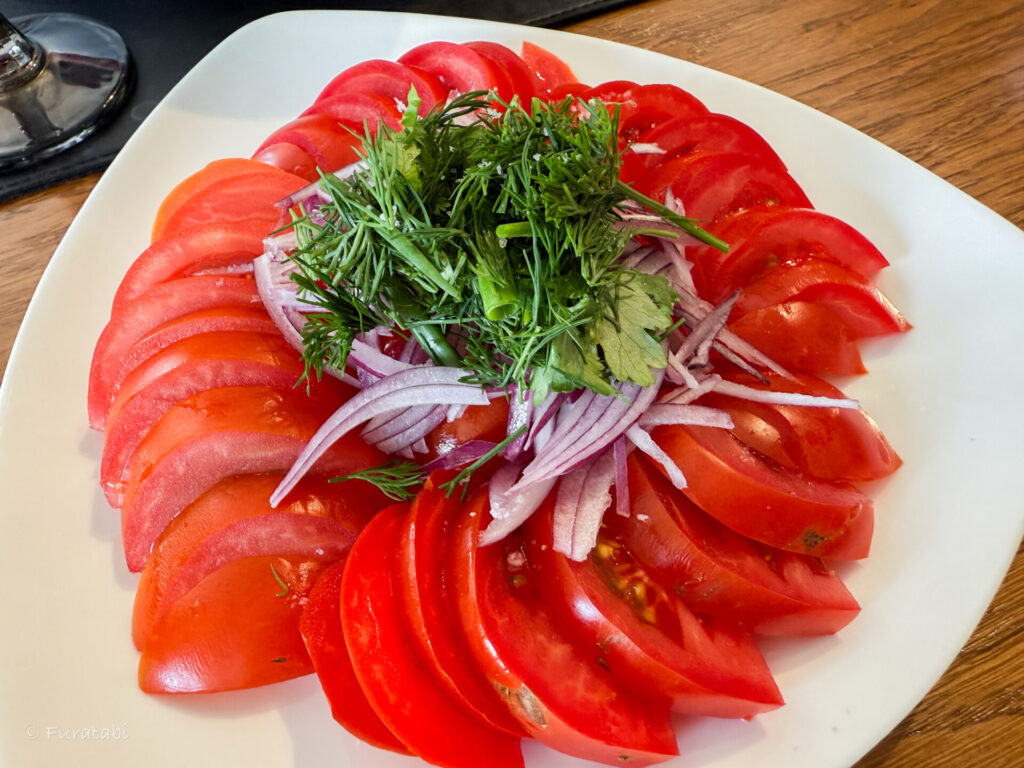 ウズベキスタンで最も定番のサラダが「アチクチチュクサラダ(Achikchuchuk Salad)」です。トマト、きゅうり、玉ねぎに塩で味付けした、サッパリサラダです。