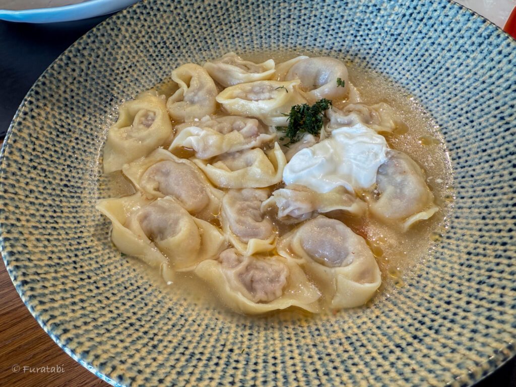 蒸し餃子の「マンティ(Manti)」は、通常ヨーグルトソースをつけていただきます。優しい味で、日本人にとっても食べやすいと思います。