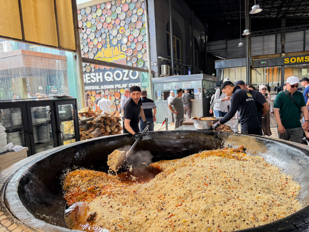 プロフで有名なお店は、タシュケントにあるベシュコゾン1号店・中央アジアプロフセンター(Besh Qozon Plov Center)。大きな釜で調理しているのが印象的です。おすすめは、トイオシュプロフ(to’y oshi)。結婚式のプロフ、という意味で、元々は結婚式前に食べられるものですが、一般的にも広く食べられています。
