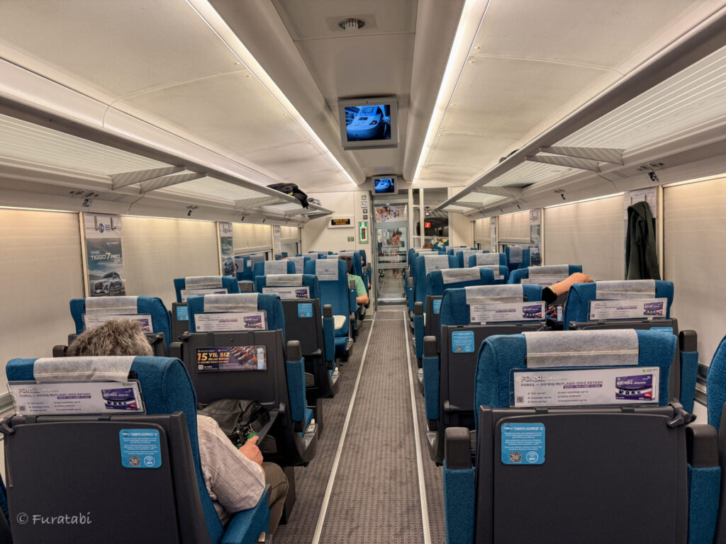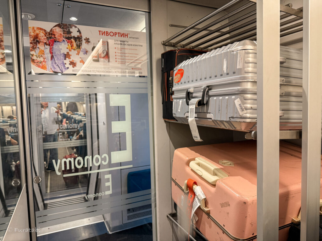 ドアの前に立っている係の方にチケットとパスポートなどの身分証明証を見せて乗車します。エコノミークラスは、日本の新幹線をちょっと簡易的にした感じの造り。スーツケース置き場も早いもの順ですが、無料で使うことができます。
