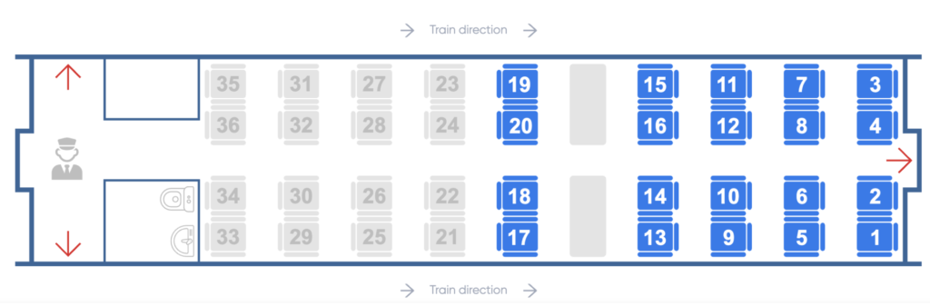 座席を選ぶ際には、進行方向に注意しましょう。Train directionの矢印が進行方向です。また、列車によっては、中央に向かい合う席があります。知らずに取ると、知らない人と長時間向かい合わせになるので、注意してください。